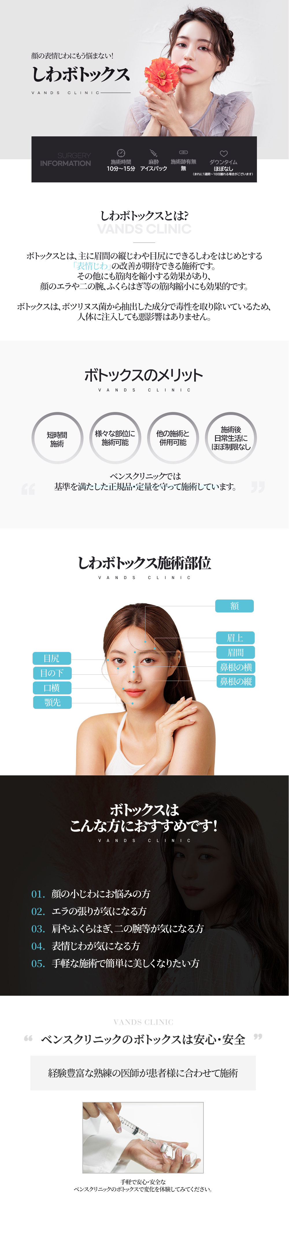 ・表情ジワボトックス:約2〜3ヶ月 / 最短2ヶ月、推奨3ヶ月、リタッチは期間関係なく施術可能。