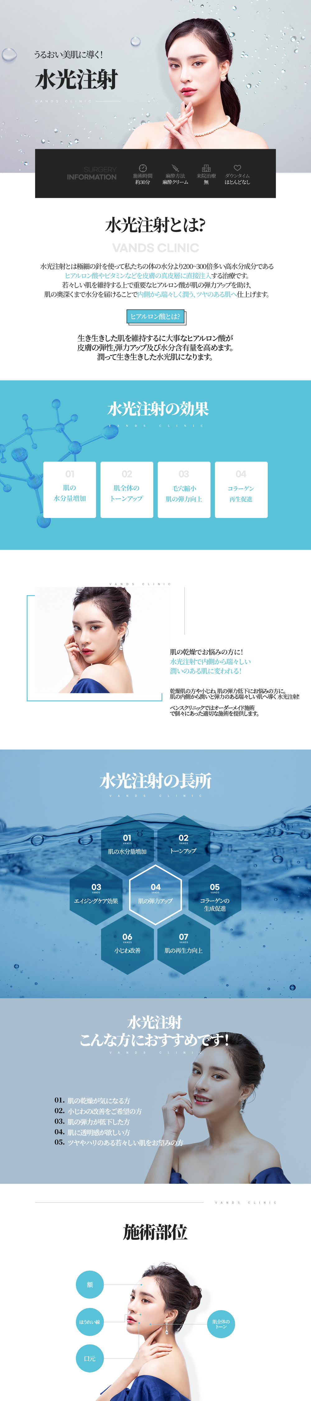 乾燥してパサついた状態のお肌に注射でヒアルロン酸をお肌の真皮層に注入し 乾燥したお肌に潤いを与え、しっかりとした潤い感でハリのあるお肌が期待できます。