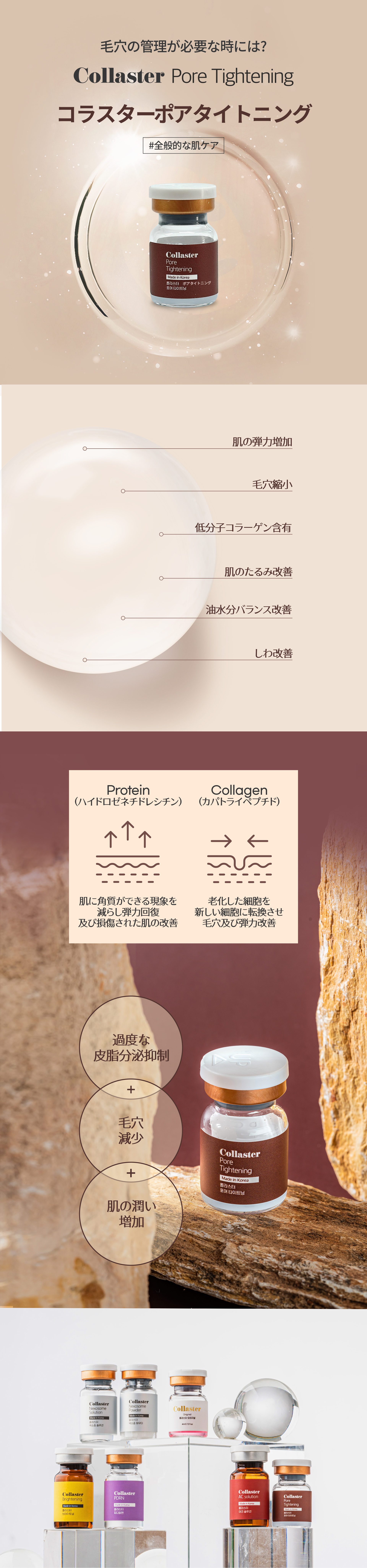 コラスターは、ポテンツァ専用の皮膚再生コラーゲンブースターです。 コラーゲン生成を促進し、肌に十分な水分感を供給して お肌にツヤを与え、お肌の弾力、小じわ、キメの改善にも効果が期待できます。